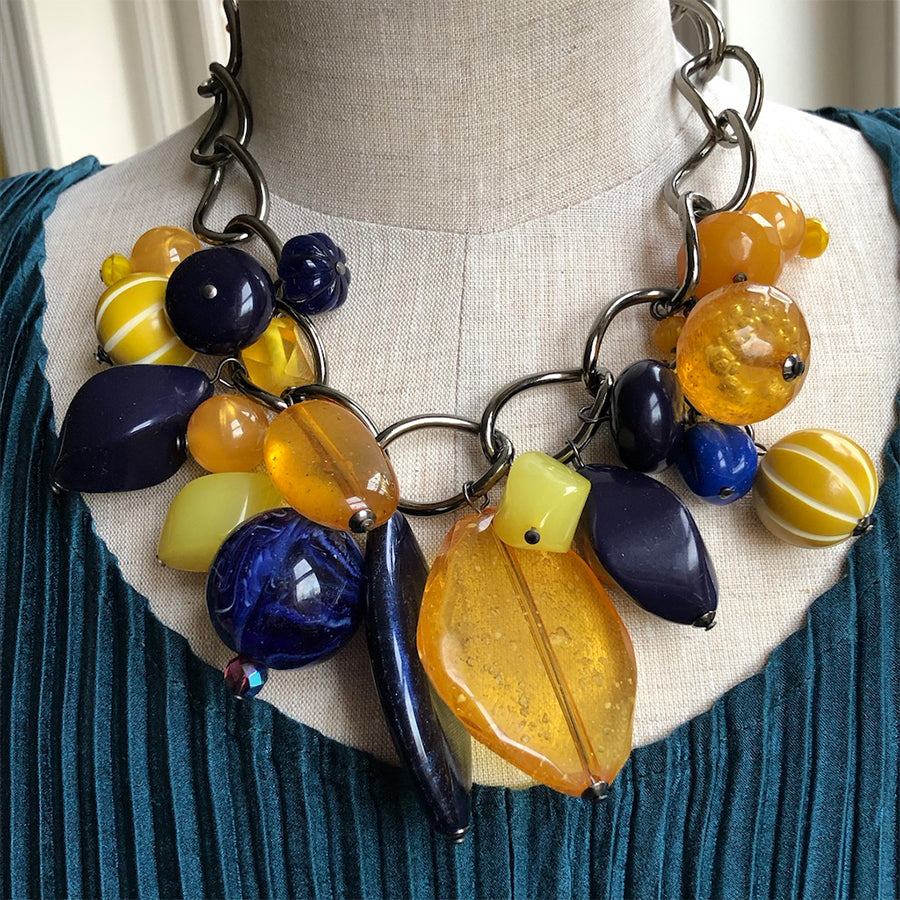 A cascade of Ukrainian colours make up this multi drop necklace. Beads from Venice, New Delhi and Czech Republic complementing each other to form this stunning necklace. The base is black plated chain and it it measures 40 cms (16") plus extension chain. The colours represent the nature in Ukraine, the yellow corn fields, the sunflowers and the blue skies.