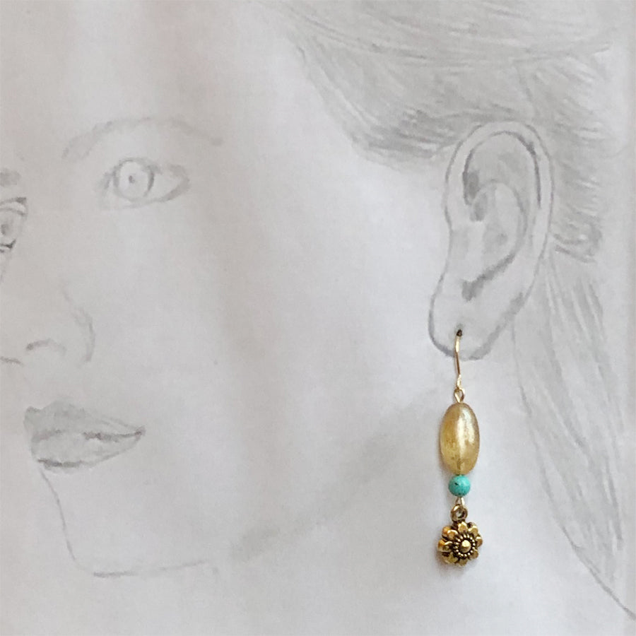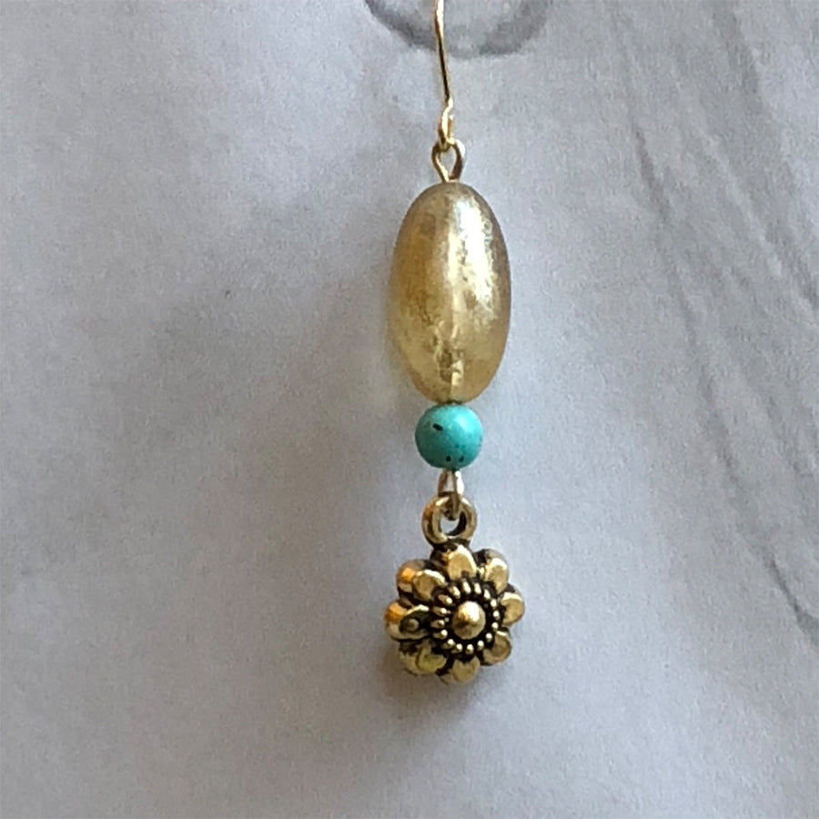 A golden sunflower drops from amber coloured resin beads and turquoise resin beads. Delicate summer earrings. They measure 5 cm (2 inches) from the top of the gold plated earwire to the base of the resin drop.