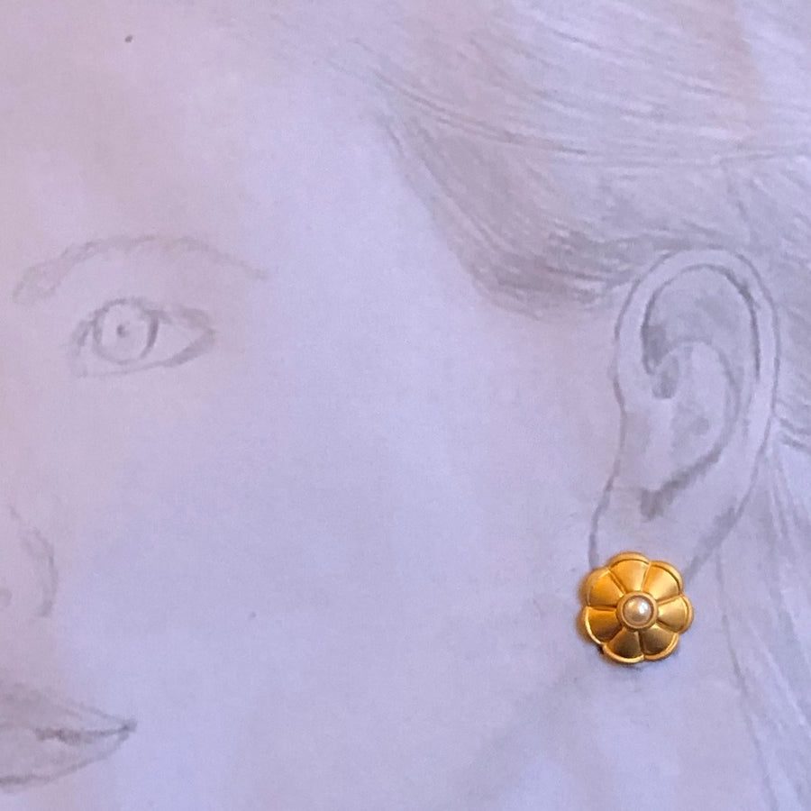 Elegant vintage clip earrings, a faux pearl cabochon centres the gold frost flower clip.
