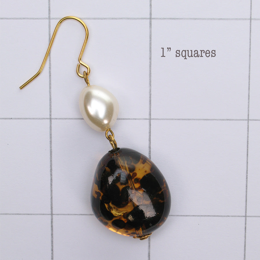 Italian acrylic tear shaped tortoise beads drop from Japanese faux baroque pearls making a stunning earring.