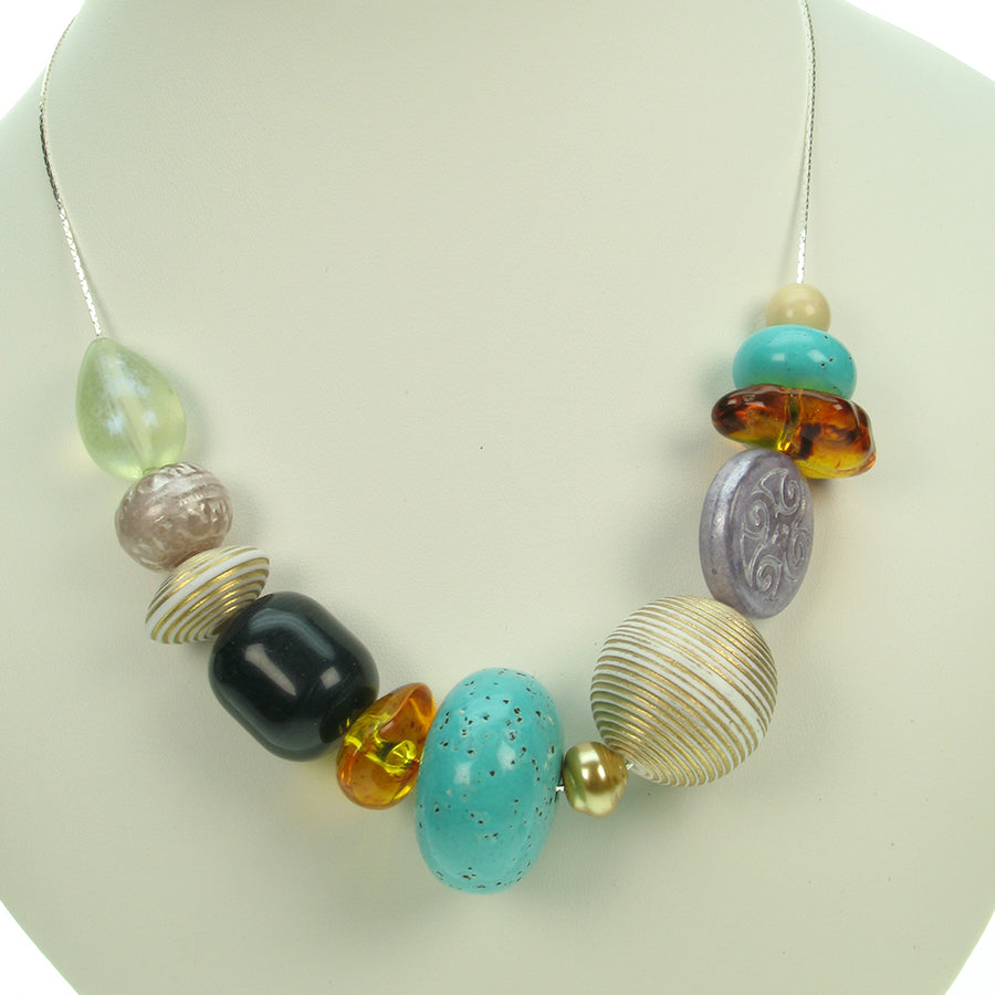 This individual mix of colours make this an eye-catching necklace to complement your wardrobe.  The necklace measures 18.5 inches (47cms) including clasp.  It can be threaded on silver plated or gold plated wire, and finished with the Angie Gooderham logo.