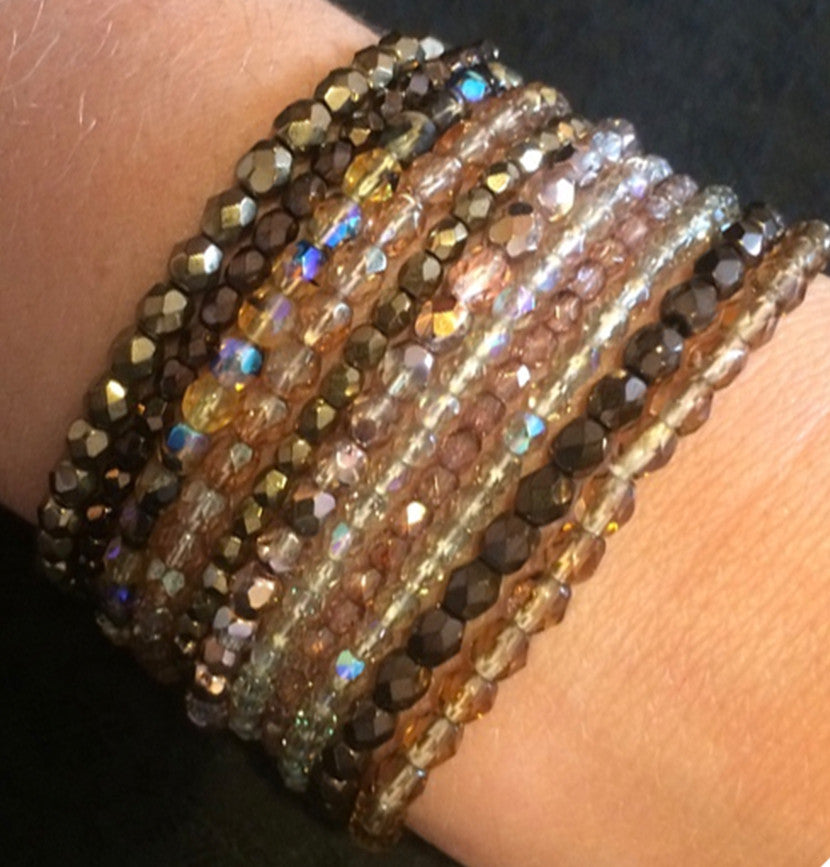 11 strands of faceted glass beads in shades of tortoise and bronze make up this bracelet. Wear it to the beach, or dress up your summer dress in the evening while you sip a mojito! Your bracelets will arrive beautifully packed in a black mesh pouch.